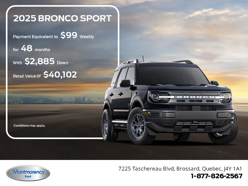 30 Until January 2, 2026 at participating dealers. Dealer trade may be necessary (but may not be available in all cases). Receive a $1,000 Bonus towards the purchase or lease of a new 2025 Bronco Sport model. Bonus not combinable with any fleet consumer incentives. See your local dealer for details.